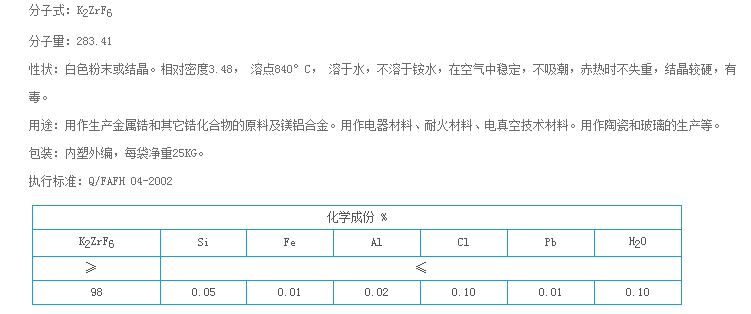 白色粉末或結晶。相對密度3.48, 溶點(diǎn)840°C, 溶于水,不溶于銨水,在空氣中穩定,不吸潮,赤熱時(shí)不失重,結晶較硬,有毒。用途:用作生產(chǎn)金屬鋯和其它鋯化合物的原料及鎂鋁合金。用作...